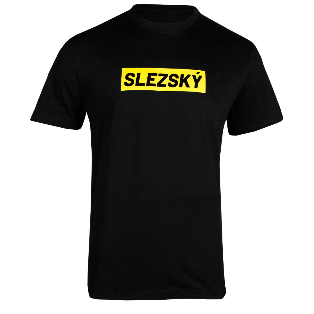 Černé pánské tričko s nápisem SLEZSKÝ ve žlutém rámečku.