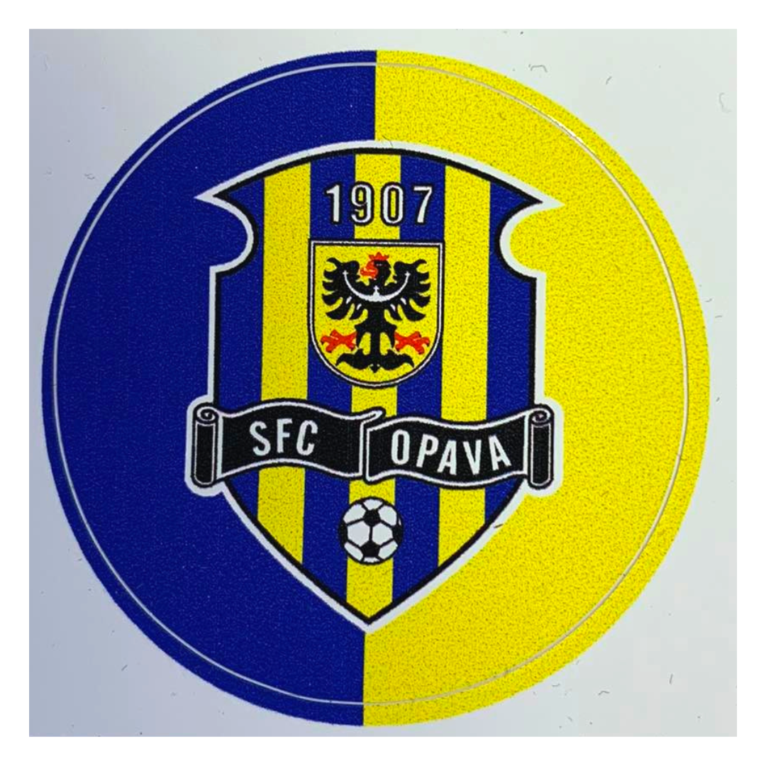 Samolepka s logem klubu na žlutomodrém pruhovaném pozadí.