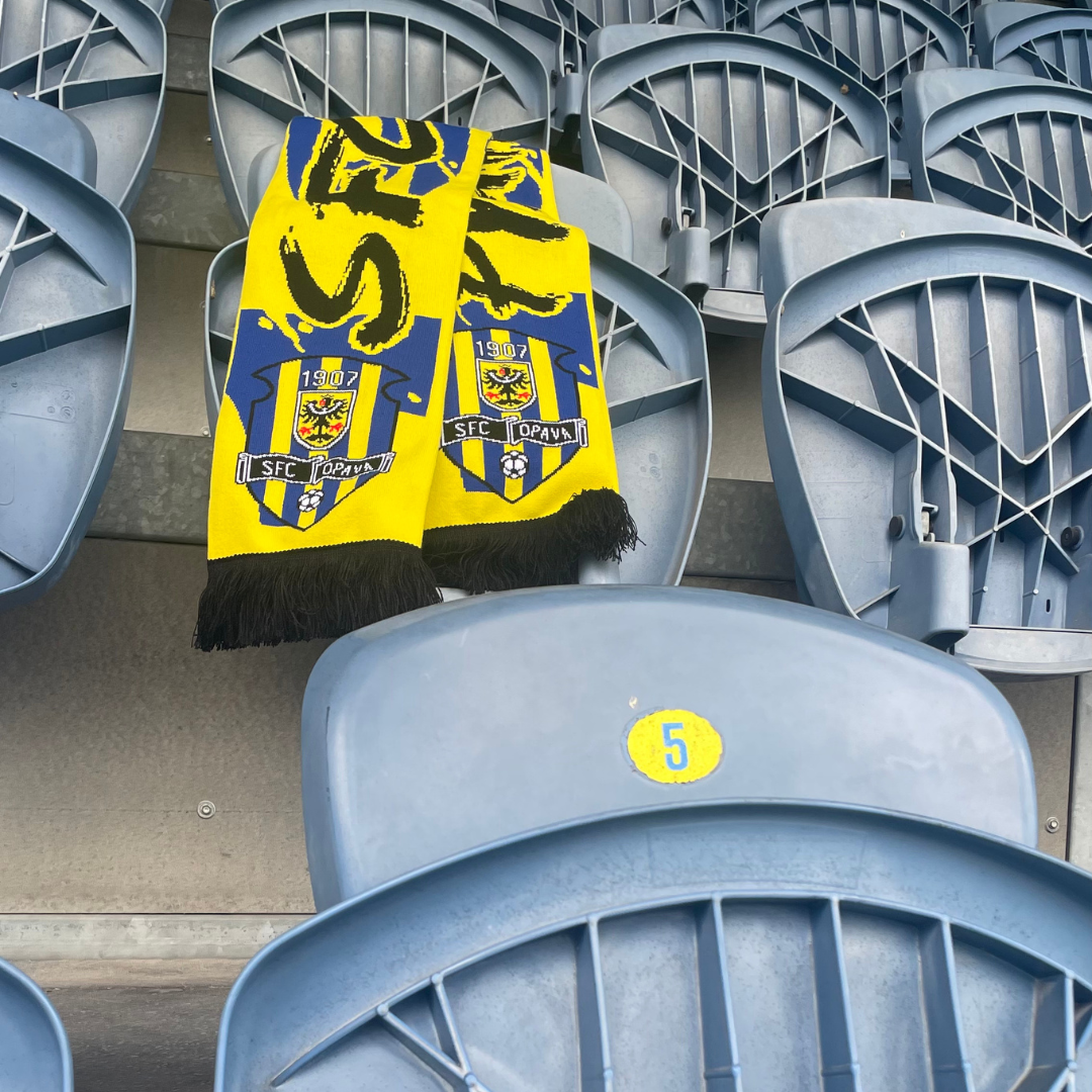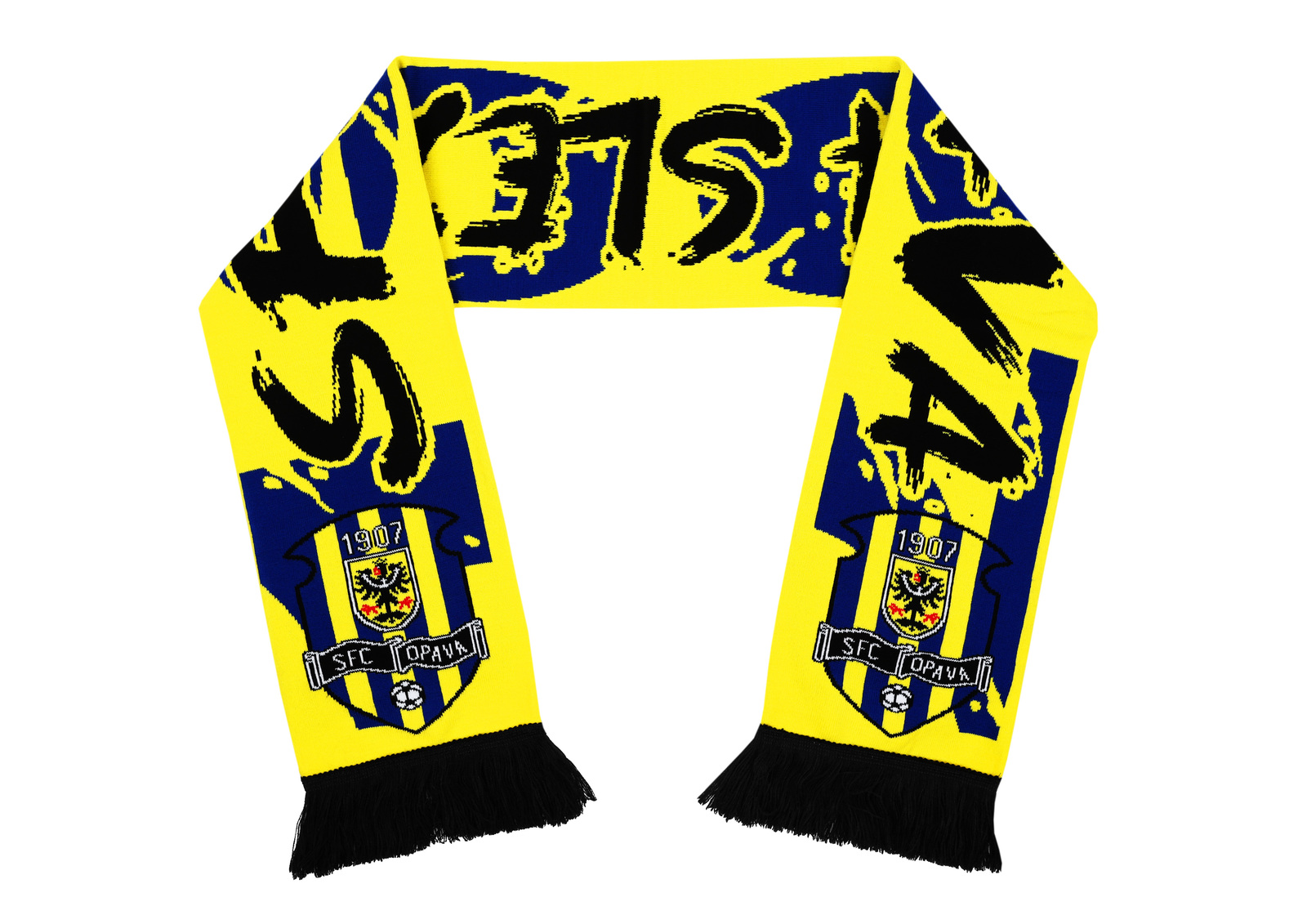 Hlavním motivem je heslo PÝCHA SLEZSKA s nápisem 1907 v pozadí. Na rubové straně šály pak dominuje nápis SFC Opava rovněž s podkresem letopočtu založení našeho klubu. Šála je dále doplněna o černé třásně.