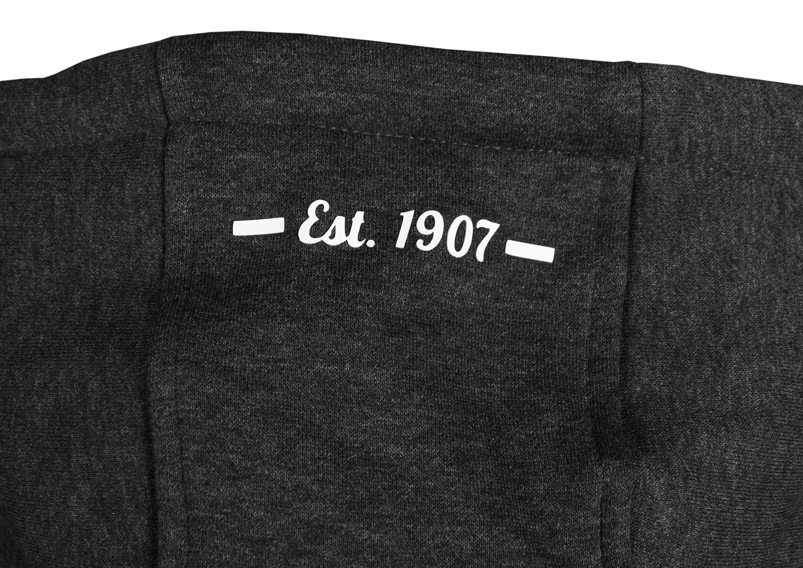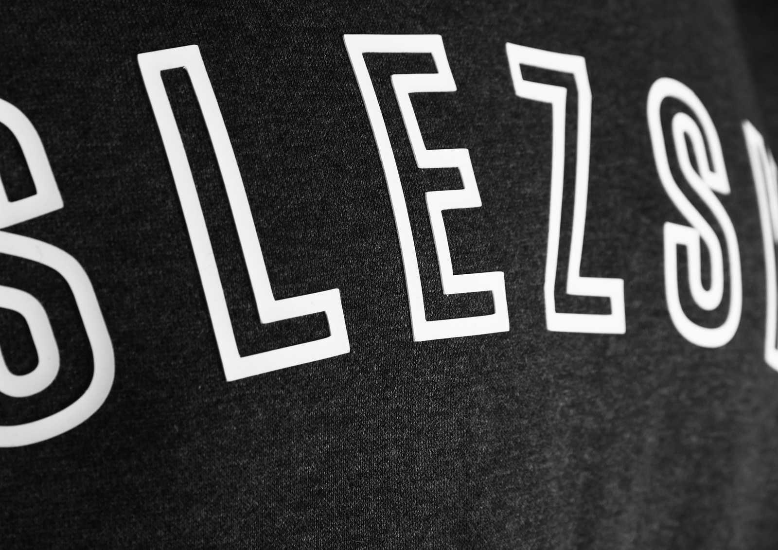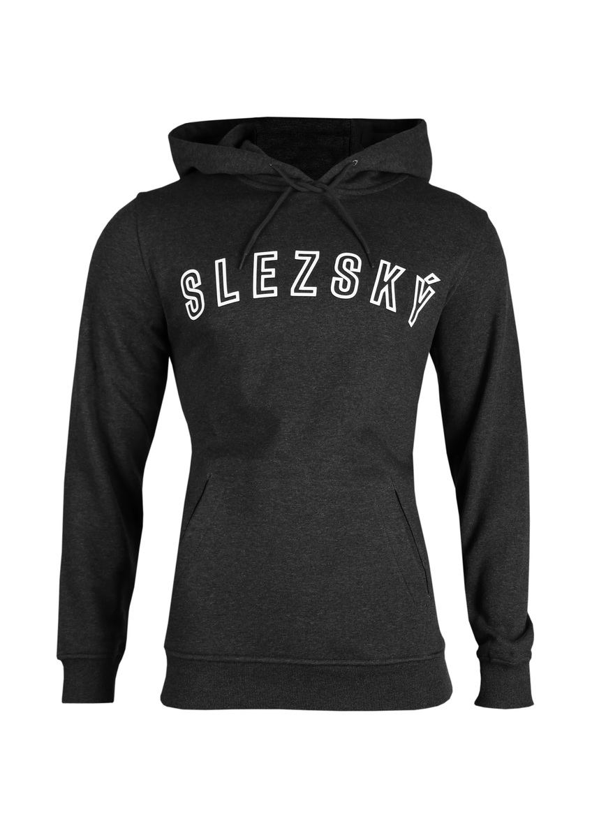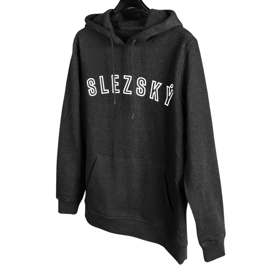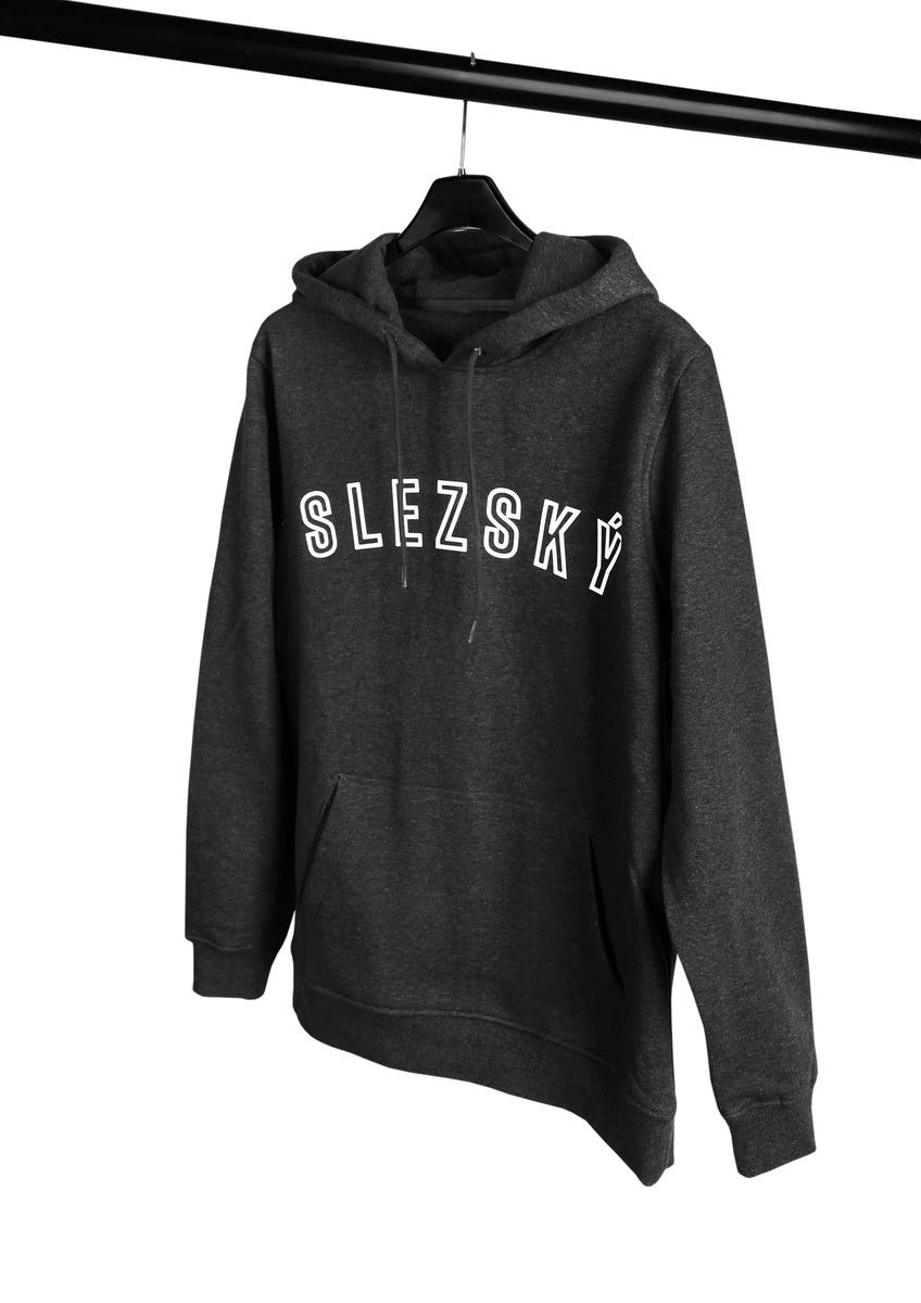 Tmavě šedá mikina s vysouplým nápisem SLEZSKÝ na hrudi a letopočtem 1907 umístěným na zadní straně kapuce.